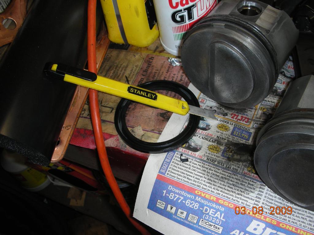 My crankshaft's sealing surface is a little undersized (arrggghhh!). I'm carefully trimming the split seal a little and shortening the spring from 8-1/4" to 8" in hopes that maybe my rear main won't leak like a sieve