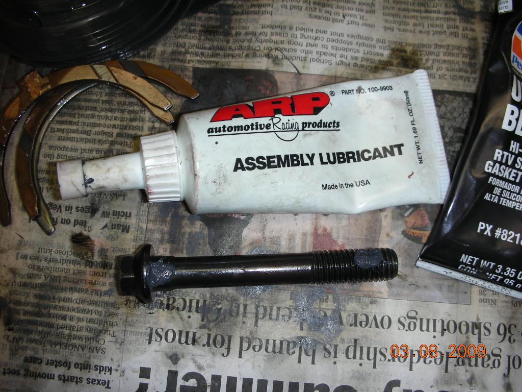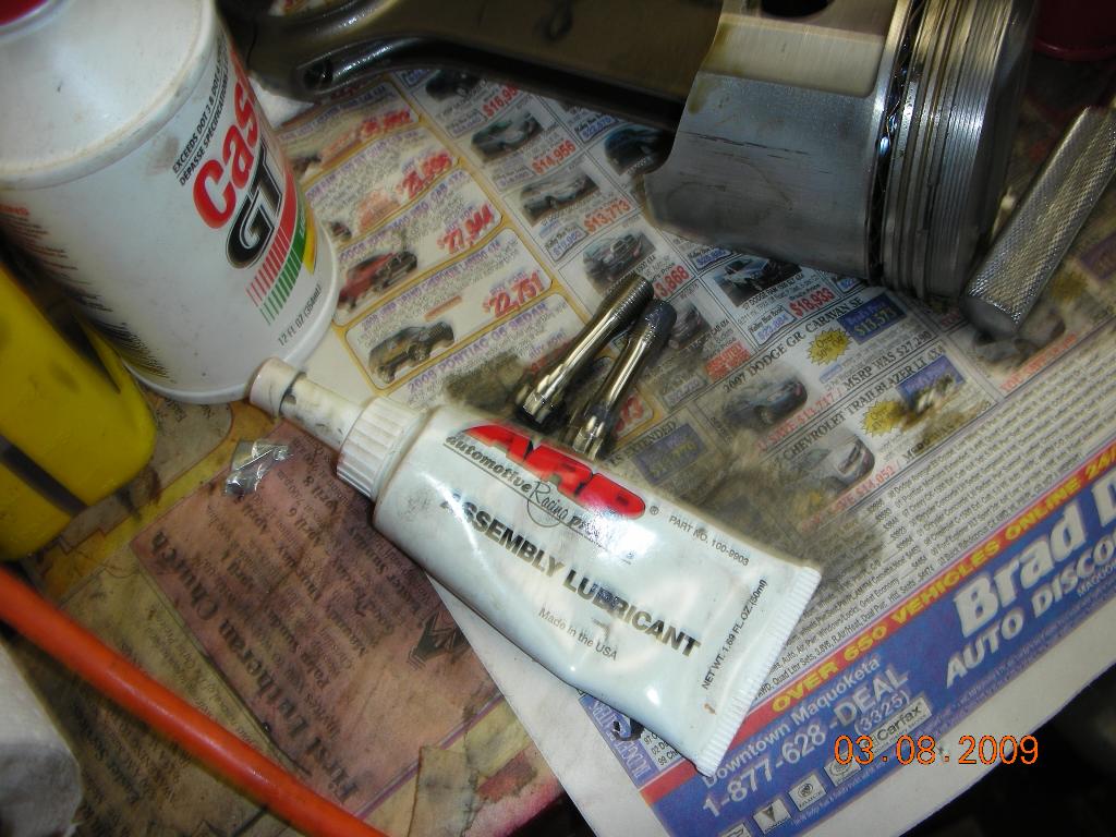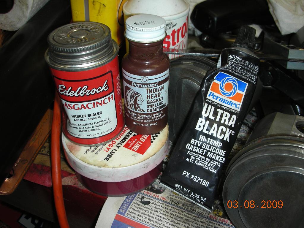 Here are most of the sealants I'll use. Edelbrock Gasgacinch for the head gasket, Permatex Indian Head, and Permatex Ultra Black. I also use Permatex Ultra Copper on a couple of parts - the front plate to block and water pump to block. Redline Assembly Lubricant is used on most of the moving surfaces and ARP Assembly Lubricant is used on all of the ARP bolts and studs.