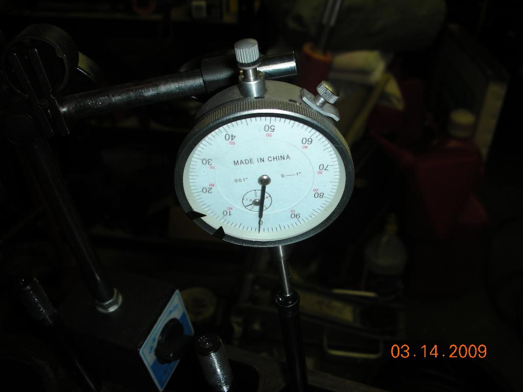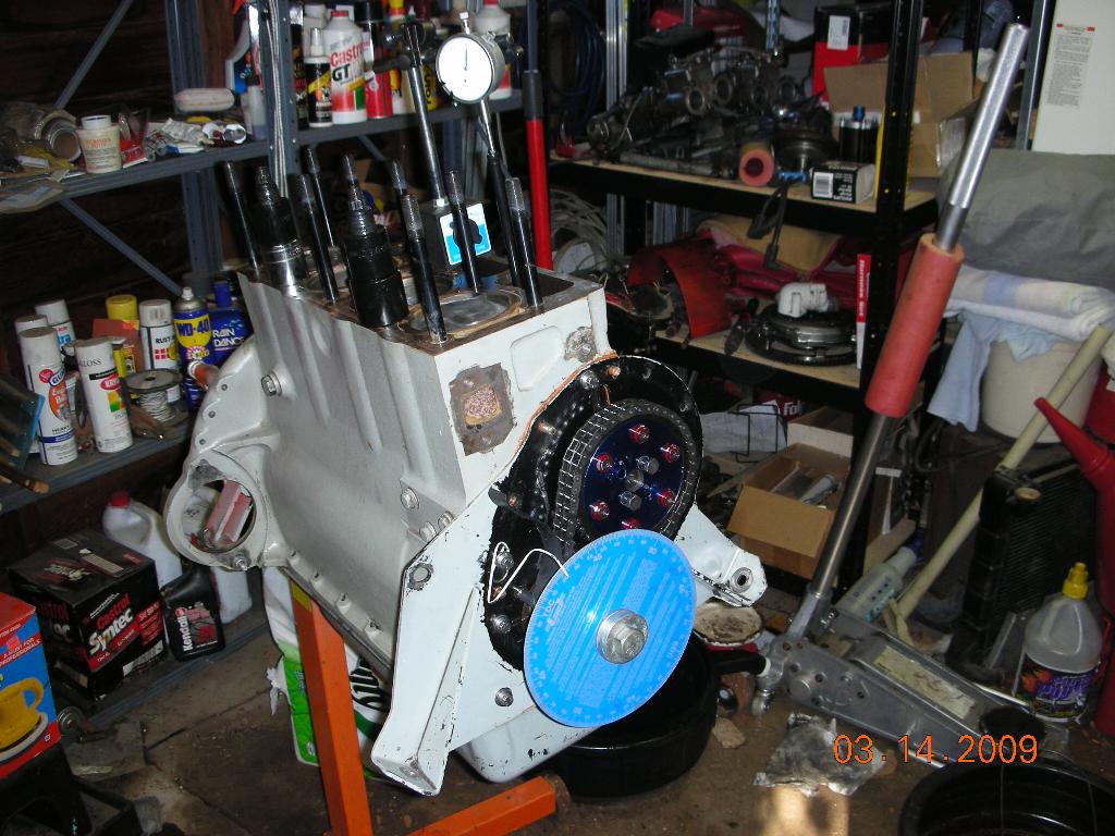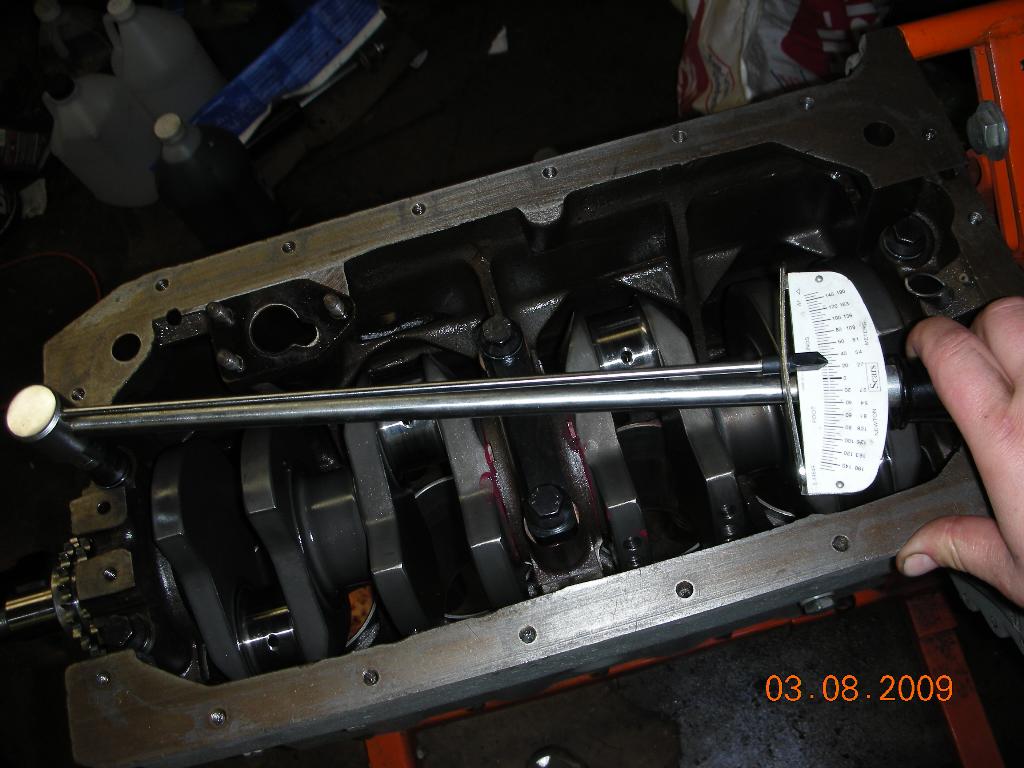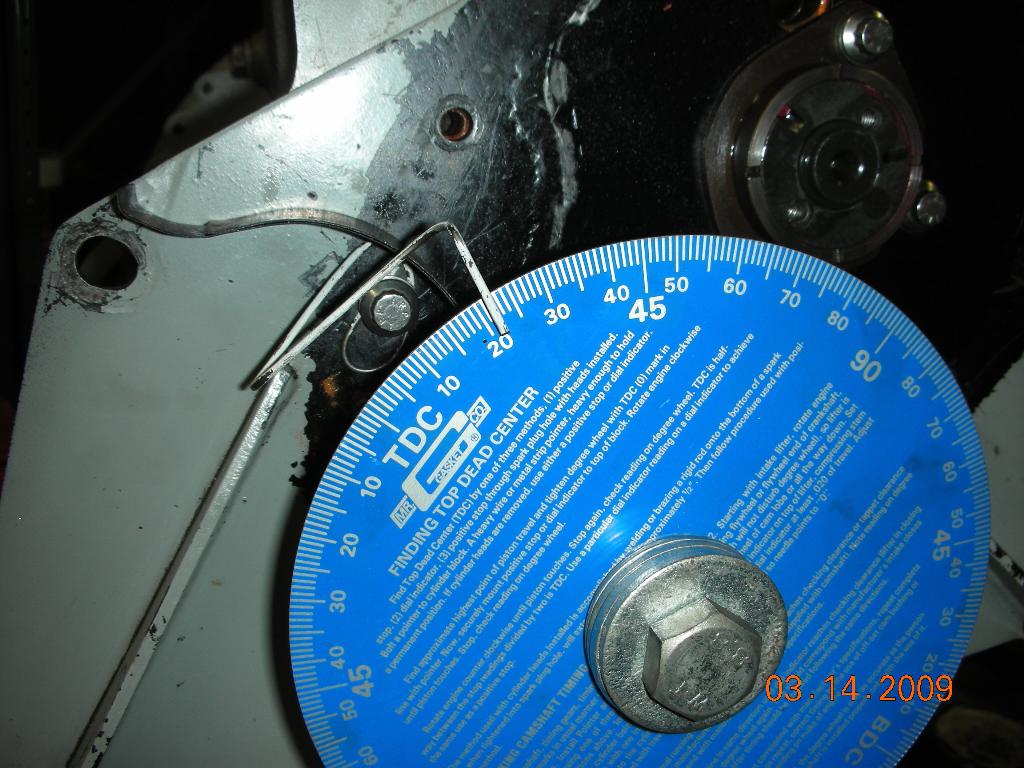 Now we come to "degreeing the cam". I put a degree wheel on the front of the crank, and use a dial indicator to set the top dead center (TDC) mark accurately.