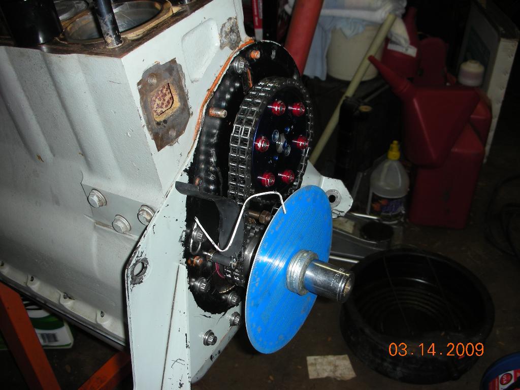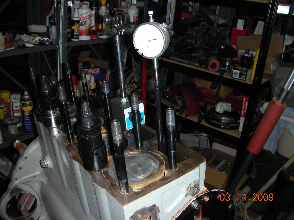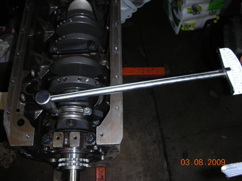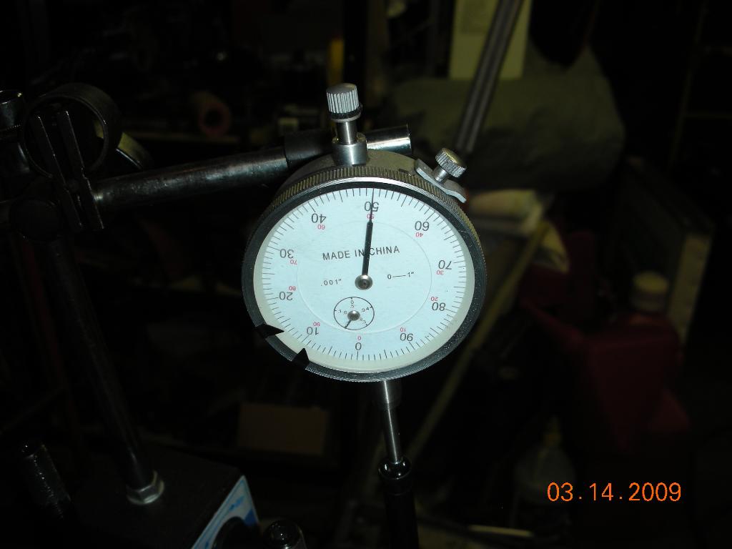 Now we come to "degreeing the cam". I put a degree wheel on the front of the crank, and use a dial indicator to set the top dead center (TDC) mark accurately.