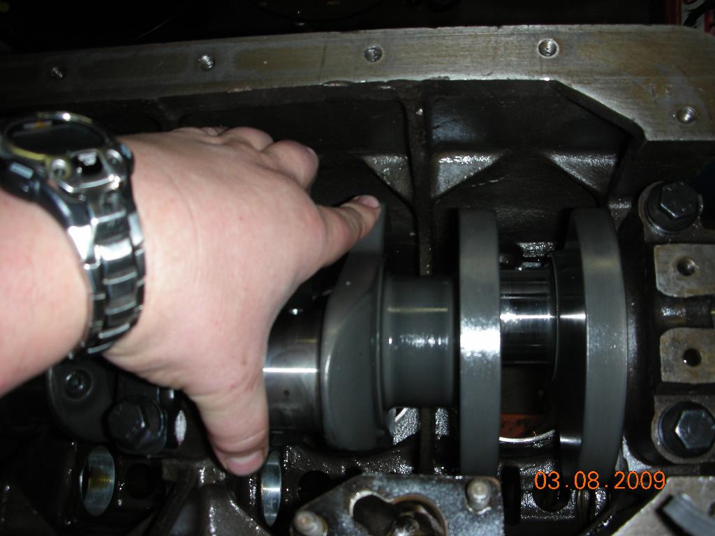 After torquing main caps, verify that the crank still turns freely. Here you see me turn it by hand.