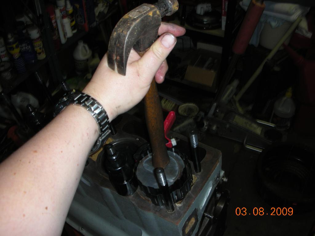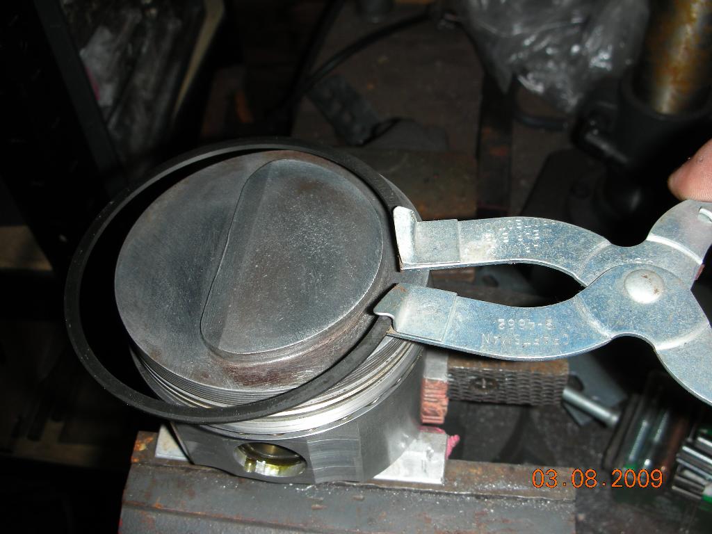 Carefully install rings on piston, making sure end gaps don't line up. I've got the oil ring bottom 90 degrees from the wrist pin (top oil ring is rotated 180 degrees from the bottom one), the 2nd ring is pointing to one wrist pin hole, and the top ring is pointing to the other wrist pin hole. Use piston ring compressor and carefully tap into liner with handle end of a hammer. Be sure that the connecting rod doesn't hit the crank journal - guide the end with your hand if you can.