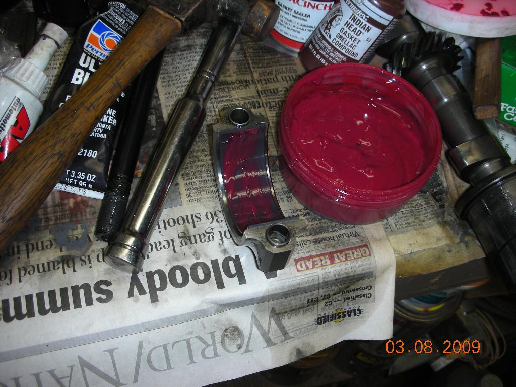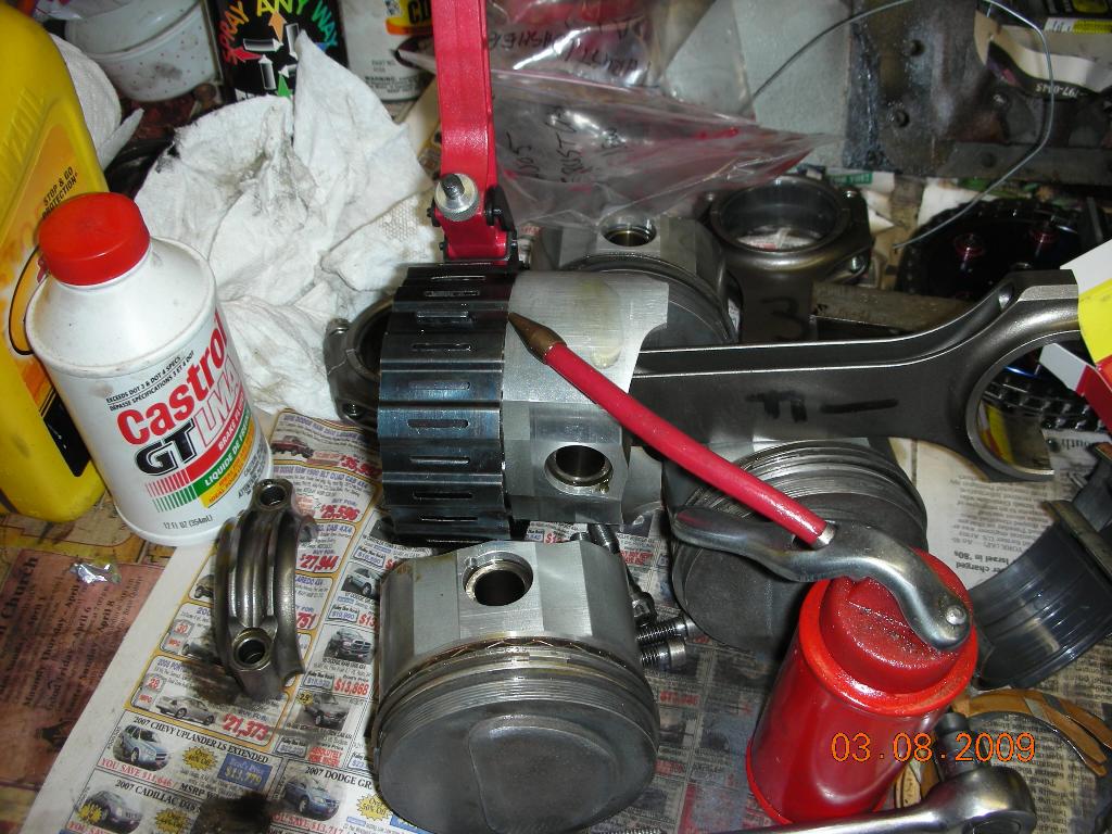 I install the pistons one at a time and assemble the rod cap to the rod, using assembly lube, of course. I install the bearing into the rod after piston installation. By the way, my bearings are ceramic coated by Calico Coatings - http://www.calicocoatings.com/bearings.html . After the last disassembly, I'm sold on this technology! Rod bearing caps are matched to the rod, but if you lose the orientation, the "notch" is on the same side on the rod and the cap. Same with the main bearing caps. My Carillo rods have "CARR" bolts - using ARP assembly lube, they should be torqued to 65 ft lbs. A stretch gauge is more accurate, though. Verify free movement of crank after the installation of each rod.