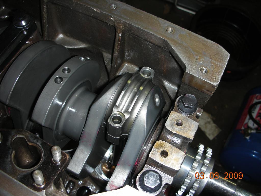I don't show the thrust washer installation - coat liberally with Redline assembly lube, MAKE SURE SLOTTED SIDE FACES CRANK, verify that crank end thrust is around 0.005" - put a dial indicator on the end of the crank and push forcefully each way. In my case, I needed a pair of normal thickness thrust washers and a pair of 0.005" thicker thrust washers. Crank made slightly imperfectly...