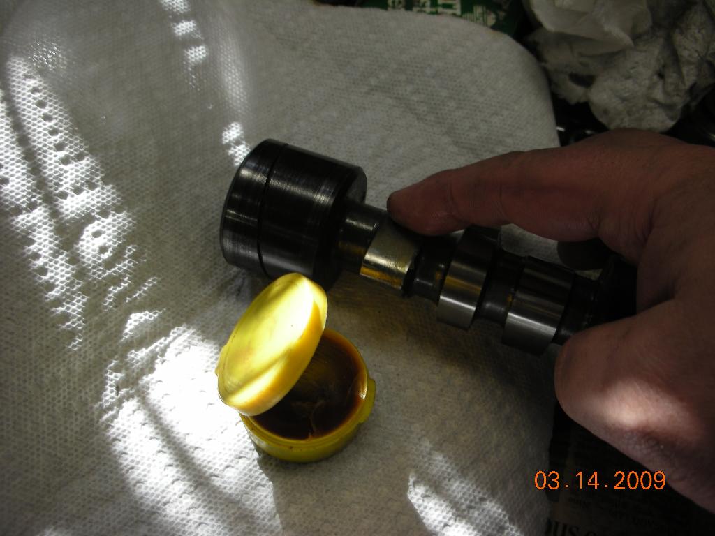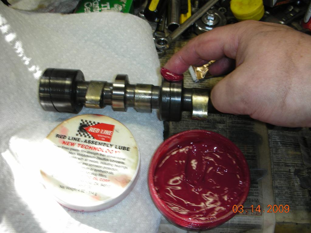 Camshaft installation - lubricate lobes with stiff cam lube (from a cam manufacturer), the journals with Redline assy lube. Use long bolts in the front to assist in installation so that the bearings don't get beat up in the installation.