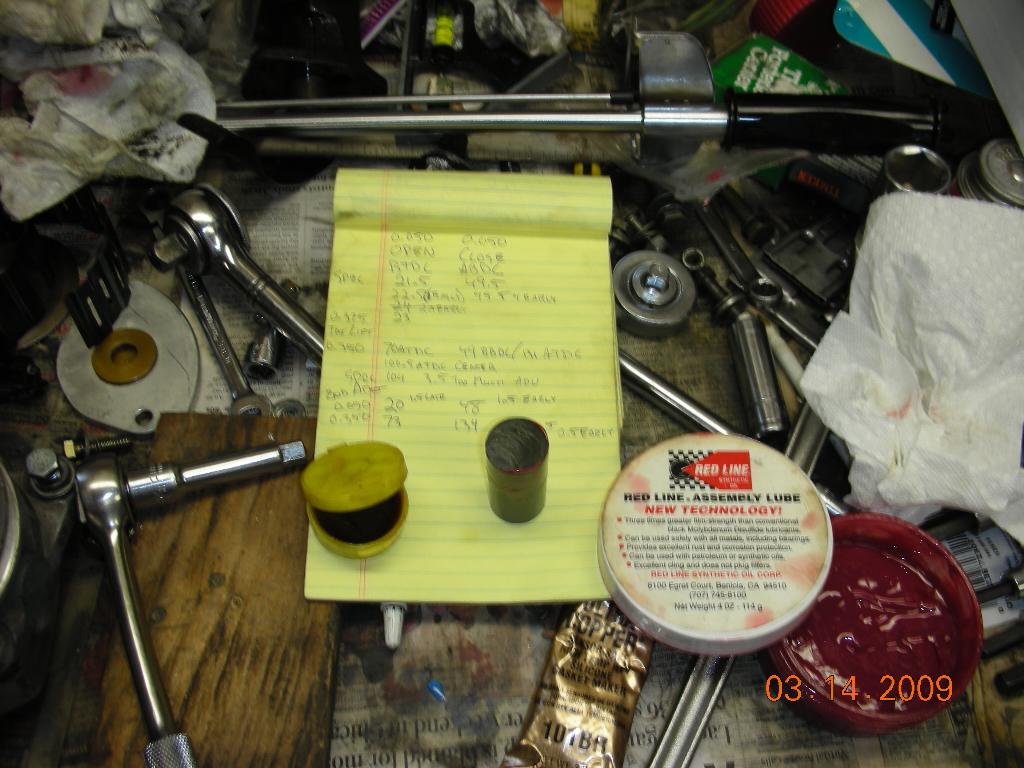 You can see the sheet where I figure the lift under the lifter. I was 3 degrees off with the initial install, and used my vernier cam sprocket to allow some adjustment - loosened the set screws, rotated the crank 3 degrees, tightened it down and verified that the setting was correct. Lube the lifters with cam lube on the foot, assembly lube on the sides. These are the super trick ceramic lifters that are no longer being made.