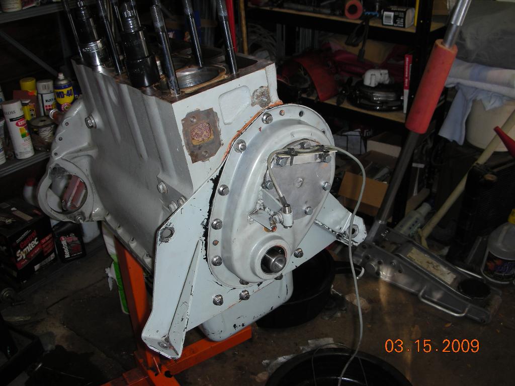 I don't show the installation of the front main aluminum block. Check the uncle jack's engine building tips for further details on that one. I trimmed the cork gasket to fit the block and mashed it in place.