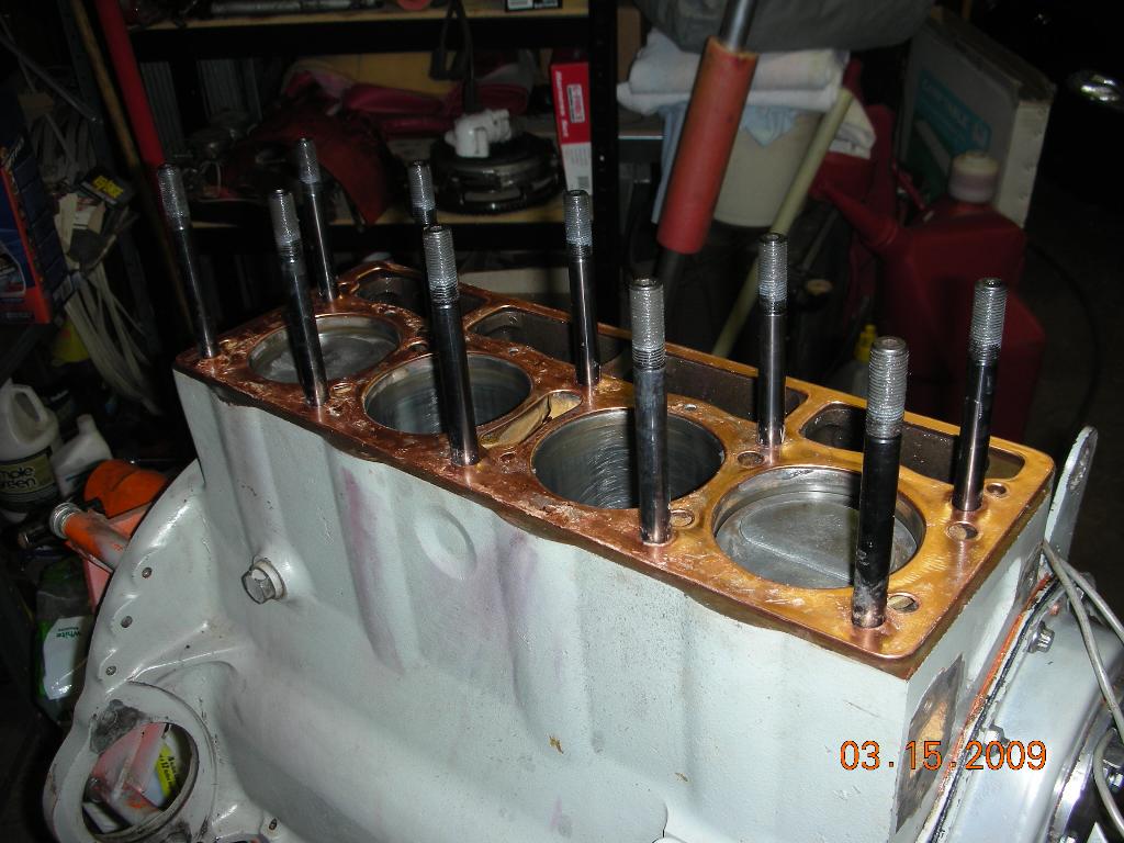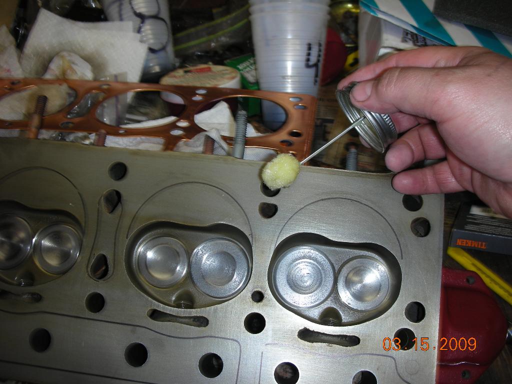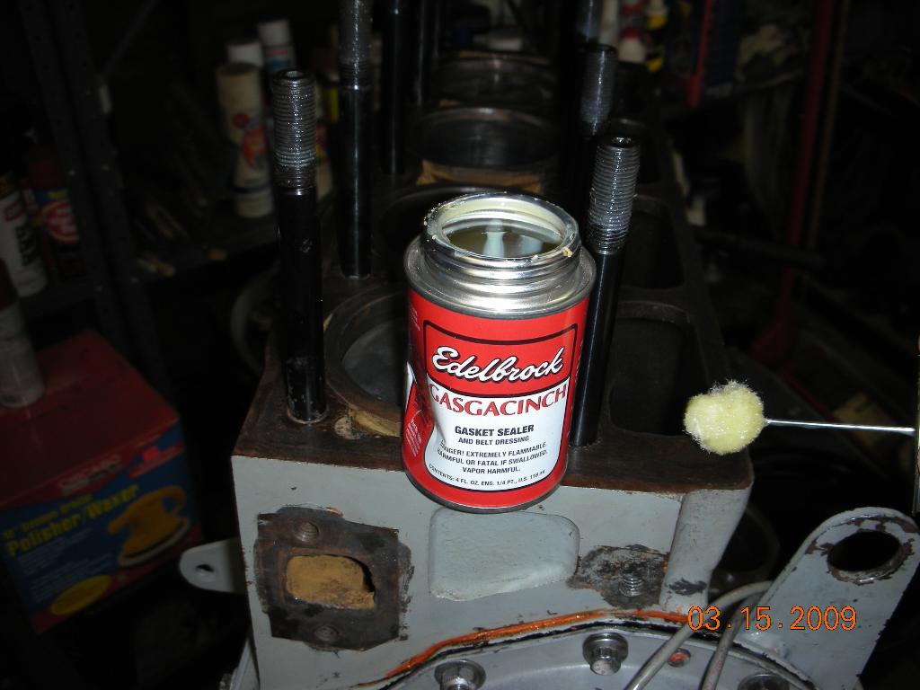Head gasket and head installation. Mark head so I know where the gasket will be. Coat head, block and both sides of head gasket with Gasgacinch. Let dry for at least 5 minutes. Assemble, lubing ARP head studs with ARP assy lube and torquing in stages up to 100 ft lbs.