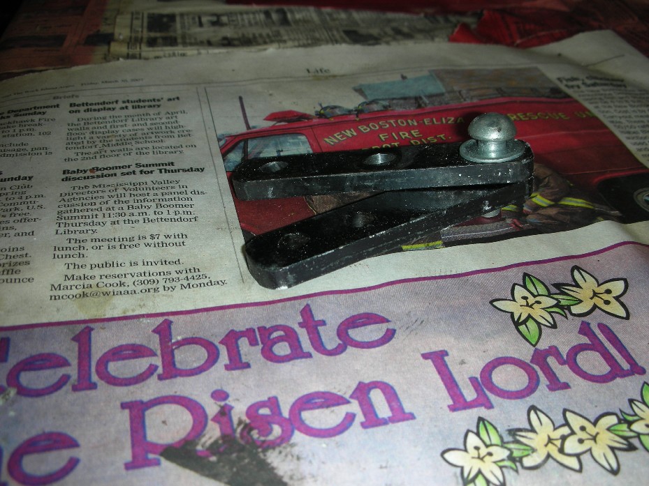 Here's a couple of shots of "balance bar" pieces. I've got several with the center hole in different places. The closer the center hole is to a given master cylinder, the more force goes to that cylinder. This seems much more in the vintage spirit than the cockpit adjustable arrangements. The shot from above is out of focus, but you can see the difference in the center hole. Changing balance bars takes less than 5 minutes.