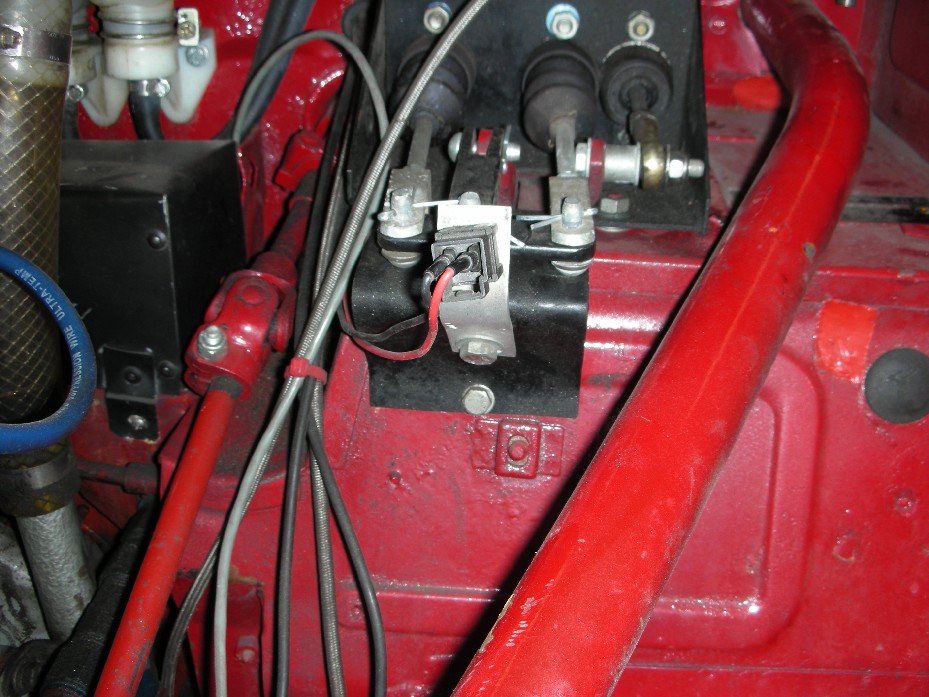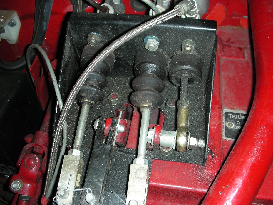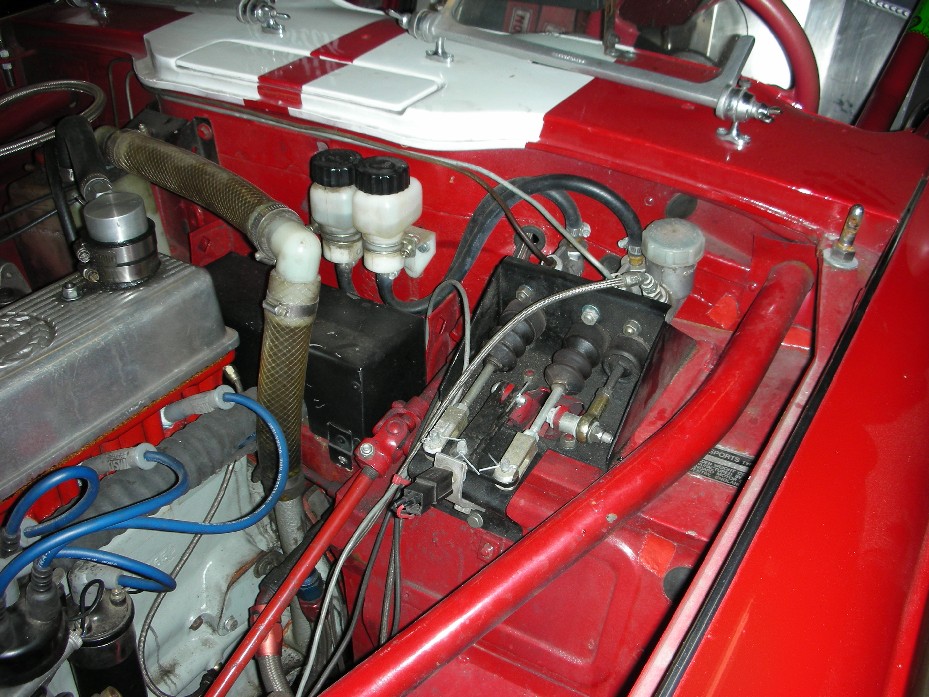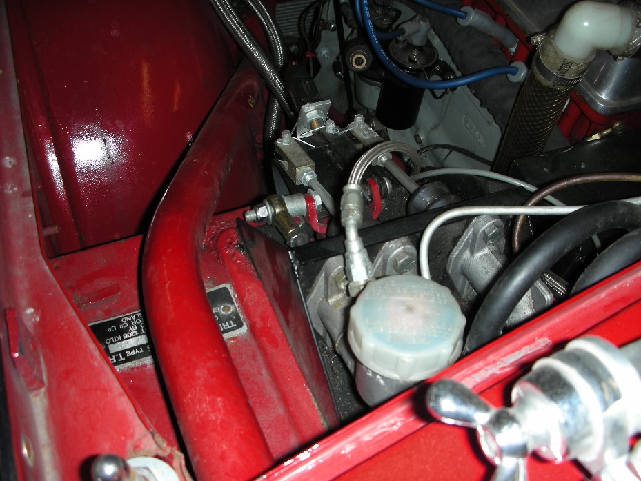 The brake master cylinders are Girling remote reservoir 5/8" (0.625") units, sourced from DRE (the Formula Vee folks) at the time. The clutch master cylinder is a stock type unit. Firewall clearance is an issue, so they need to be short. Since I made this setup, Tilton came out with "shorty" cylinders that would probably work too. The 5/8" cylinders give good pedal feel - I don't have to stand on them TOO hard to lock wheels, and the brake pedal moves an appropriate distance - I can still heel and toe. Going larger on the master cylinders will make the pedal "harder" - it reduces your mechanical advantage. So the pedal doesn't move as far and feels harder - it should be harder to lock a wheel that way, but it will also reduce the "feel". I used remote reservoirs left over from a Tilton pedal installation.