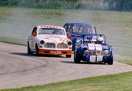 Since Mosport, searching for why the red rocket was slower than new blue, I removed the small "cherry bomb" style muffler and replaced it with a 2 1/2" to 3" adaptor and a 3" straight pipe. The sound is awesome now. It turned out that this was the tweak needed to make our cars equal in acceleration. Grattan turned out to be a mixed bag for both of us. While we had fun, Jack had the following encounter with a poorly driven porsche.