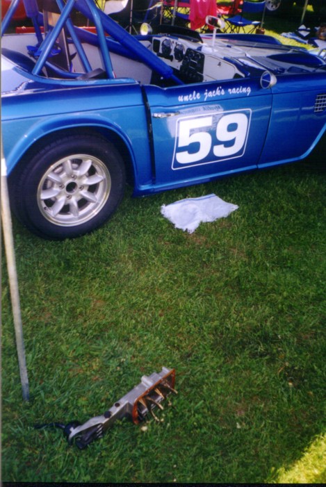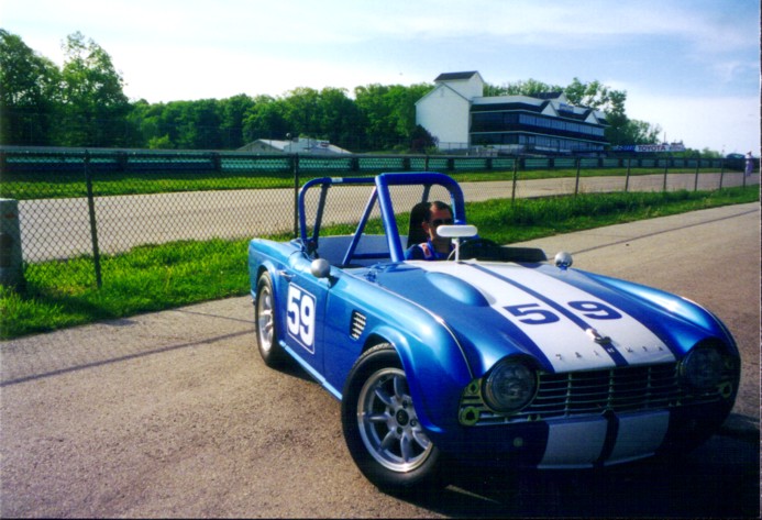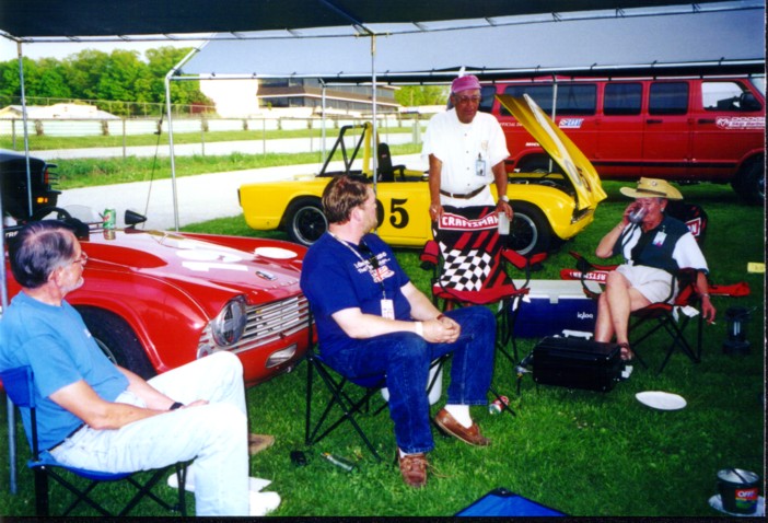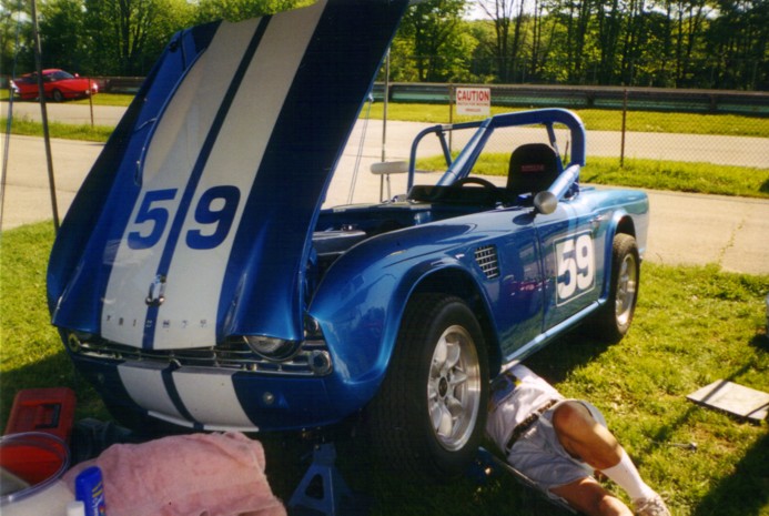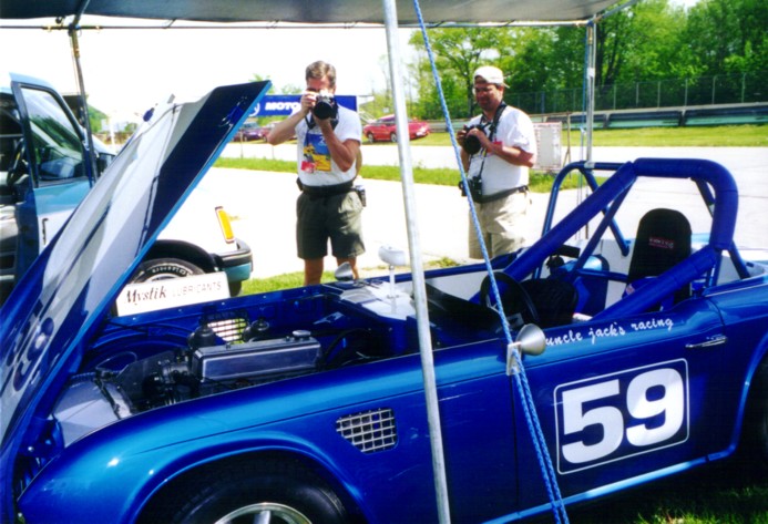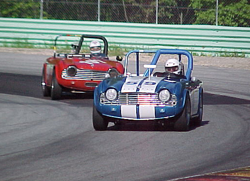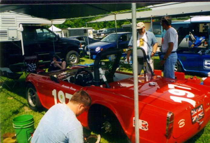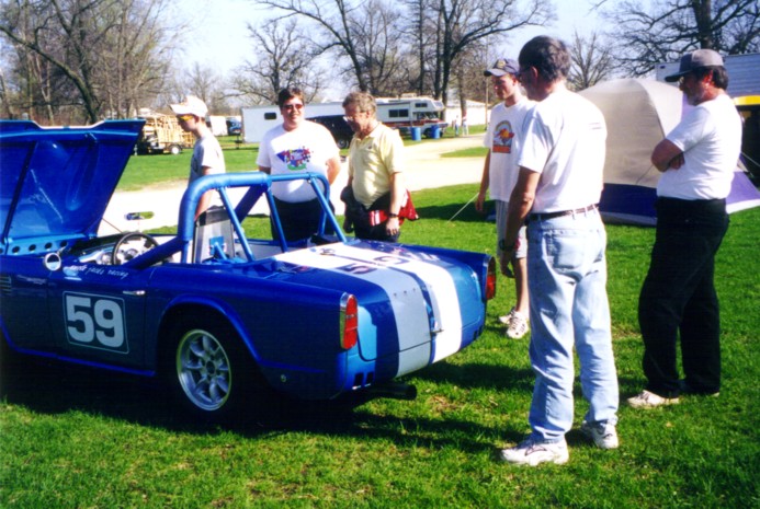 Road America, SVRA-sanctioned event in May, 2001. The car performed extremely well, besting old blue's best lap times by a second (2:54 lap time). There were some teething problems where the tranny top caused 1st and 2nd to quit working, but luckily Henry Frye had a spare. His is the yellow TR-4, best seen in the photo where Duck Waddle stops by the paddock to talk. Henry drove all the way from Connecticut to join us, and we really appreciated his presence. Some members of the Chicago Triumph Owners Association were at the race, and Joe Alexander ended up "borrowing" the rear brakes from a VERY nice TR-6 that had made the trip up. After the race, we discovered that our tach was reading 500 RPM too low causing us to short shift, and the piston rings hadn't seated properly. Look out, I see lower lap times in our future!