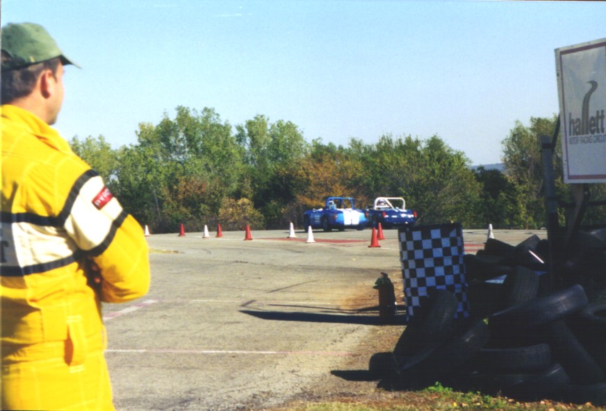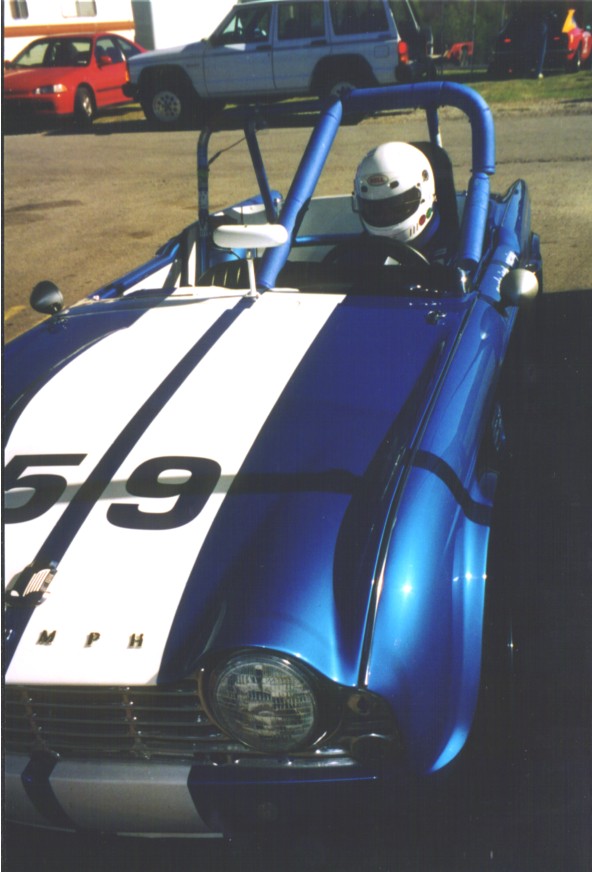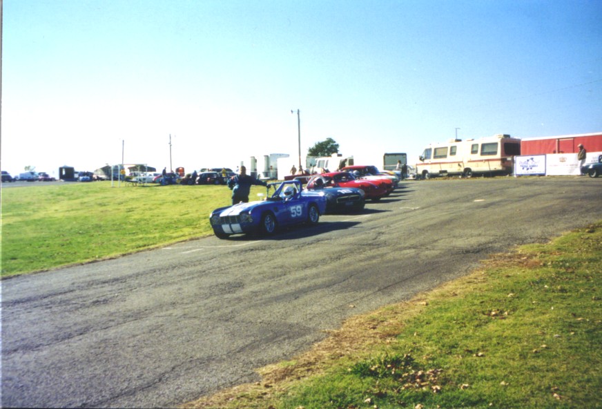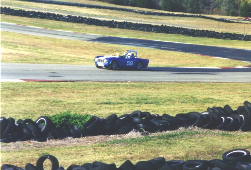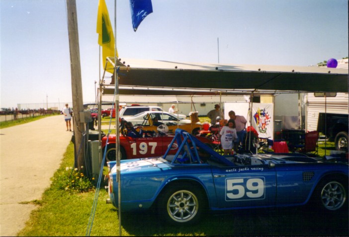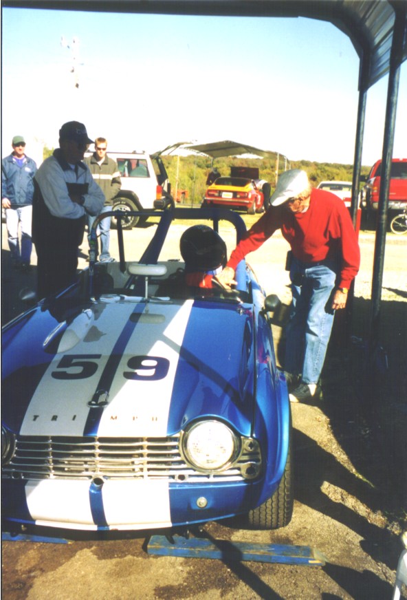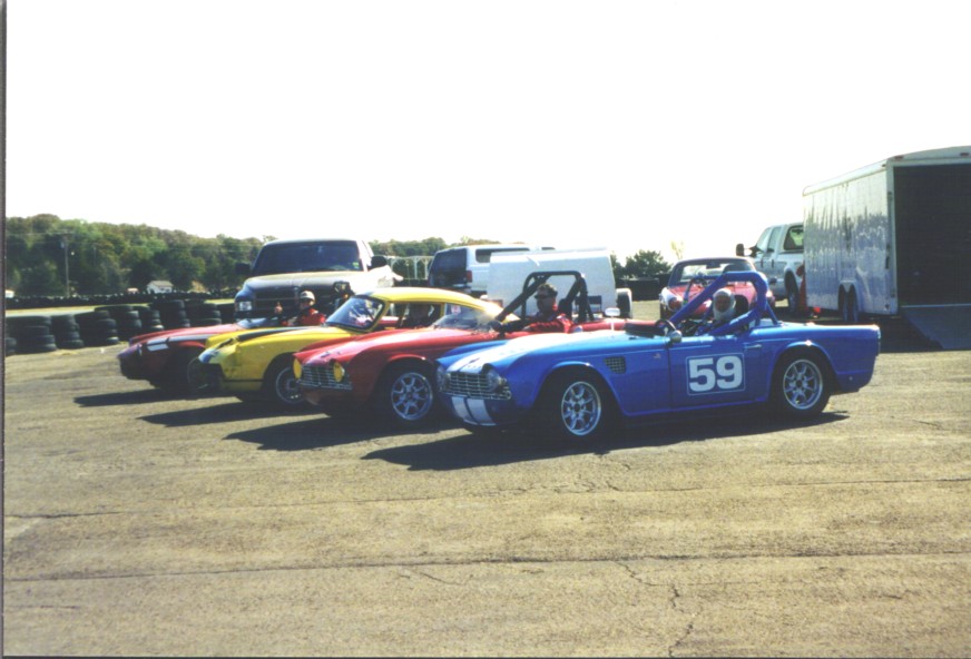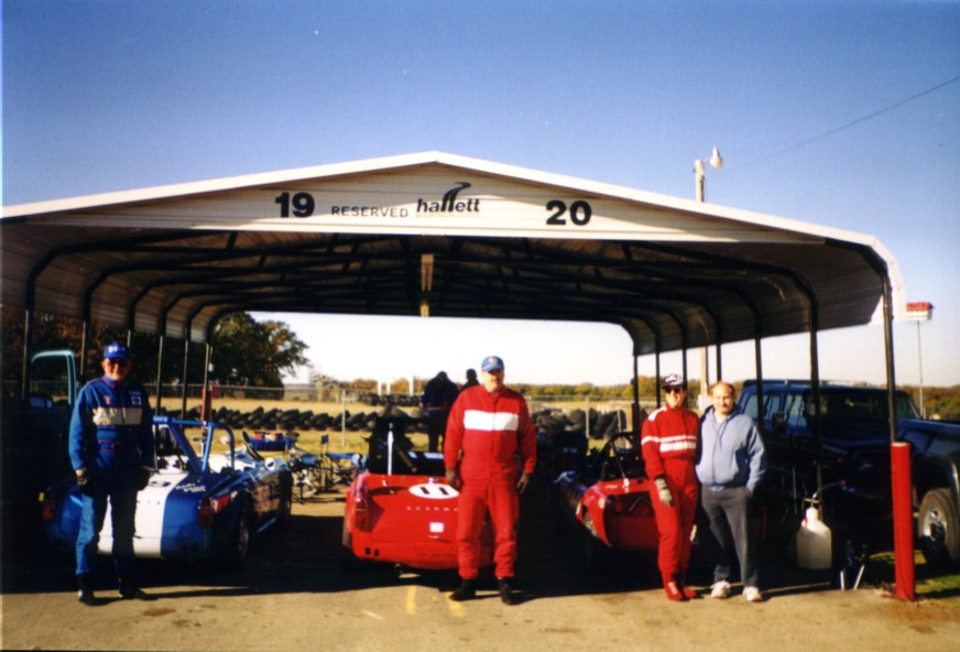 Our last race of 2001 was in Hallett, Oklahoma in late October to race with the CVAR gang. They have a great format where you run one timed practice session and then 4 races. Your grid position is determined initially by the times in practice, but races 2-4 the grid is your finishing position in the prior race. We paddocked with Susan Hensley and Brad Kahler with their Spitfire, Bob Kramer with his TR-4, and Dan Duryee with his GT-6. What fun! We qualified on the pole for race one. Jack won it leaving Tony on the pole for race 2. A wonderfully prepared and driven Mini Cooper passed Tony in race 2 relegating him to 2nd. Jack finished 2nd to the Mini in race 3. Tony won race 4 after the Mini seemed to miss a shift at the start and then spun trying to catch back up. Wonderful track, reminiscent of Grattan in Michigan. It's short, with our 3.70 rear and close ratio box, we used 1st, 2nd and 3rd (no 4th!). Best official times: Tony - 1:33.5, Jack- 1:33.7. Great company, great bunch of folks to race with, great track, great weather, great results - who could ask for more?