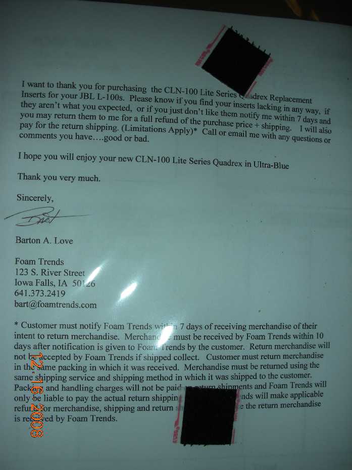 I have these Awesome JBL L-100 speakers. Purchased them through E-bay, and they seemed to have been well used. Needed to replace the tweeters, got the missing walnut grille frames from e-bay, etc. Woofers were no longer the original white - they appeared to have been in a smoke filled room for a long time. A bit of semi-gloss white, some black enamel for the wires and they look good as new again. Had to buy tweeters, the walnut grilles, and the JBL logos for the foam once I found suitable foam.