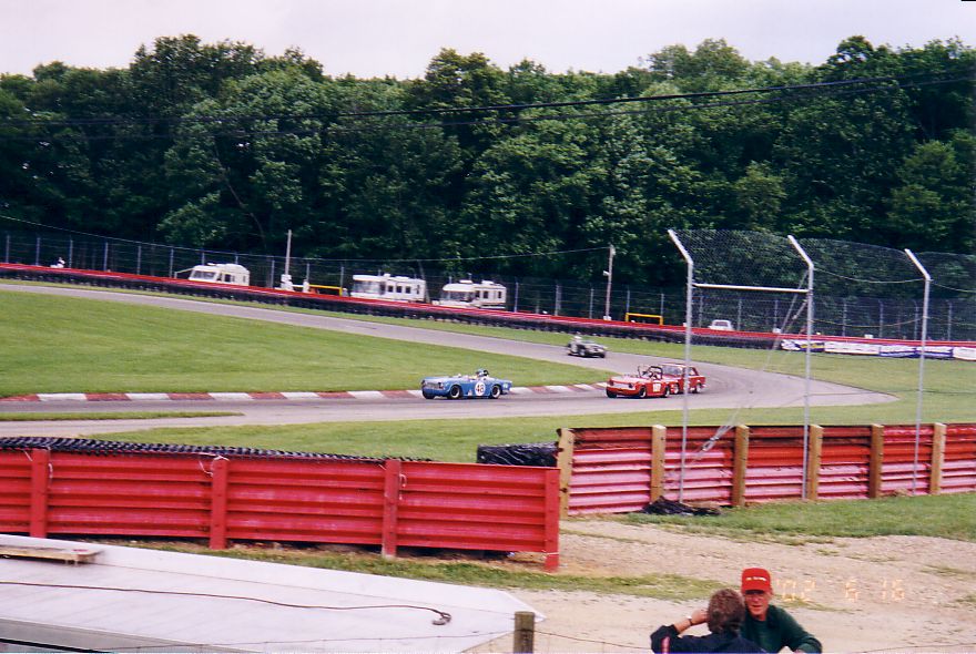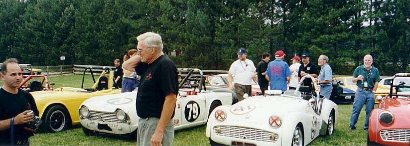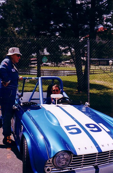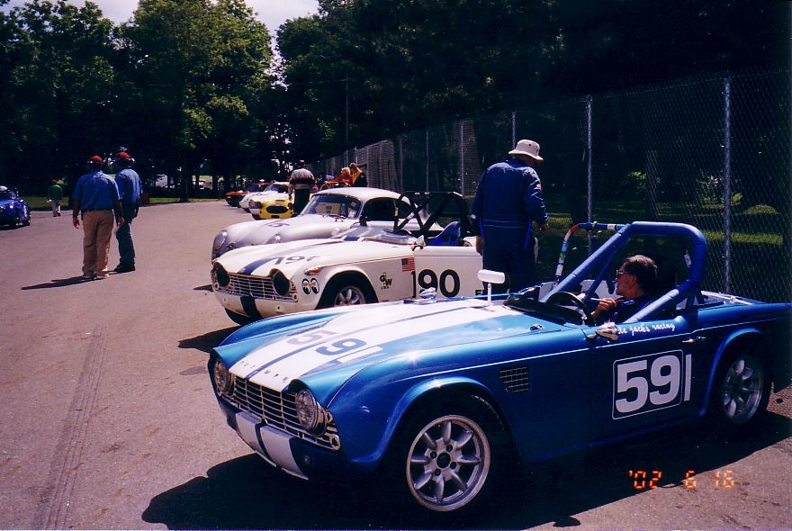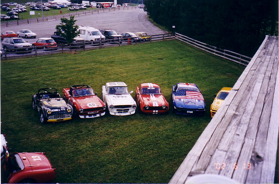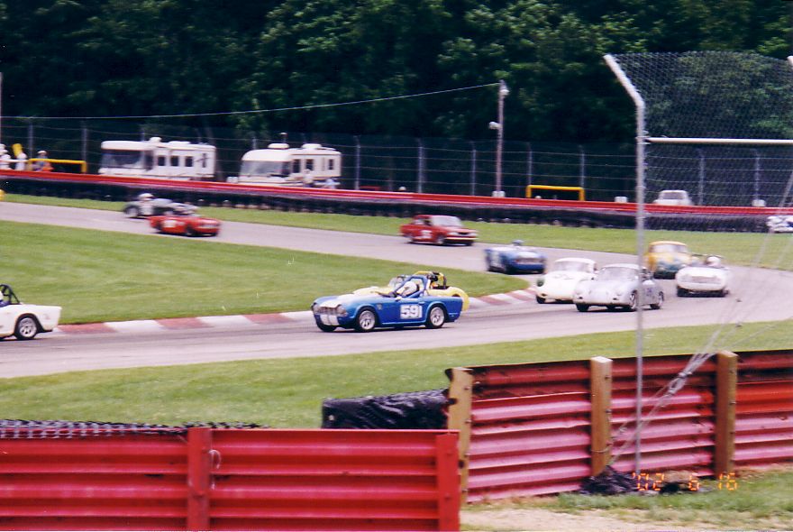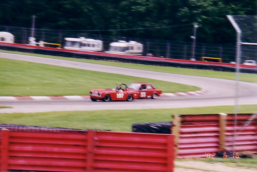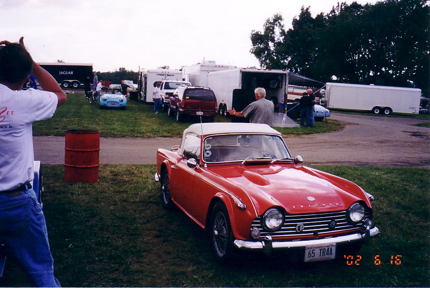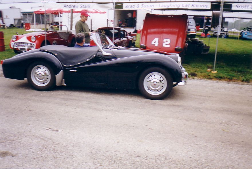 The TR-5 from England lost its front end to the concrete wall. They found a frame shop that would allow them to work on the car at night and stayed up all night fixing the machine. They got the front of a TR-250 from the Nuclear Junkyard (nuclear waste and Triumphs!), and got it back together, a can of Rustoleum Regal Red finished the job. They WON the All-Triumph race when the leading TR-7 V8 lost some of its gears. Last picture is courtesy of Scott Tilton.