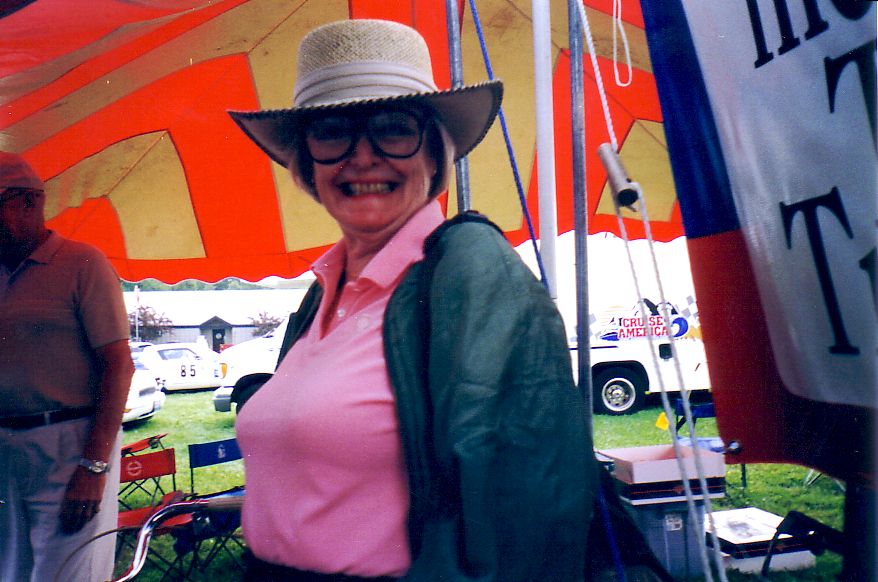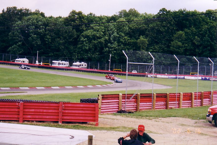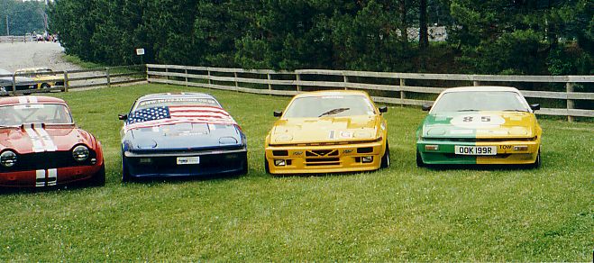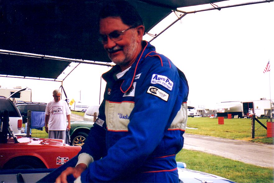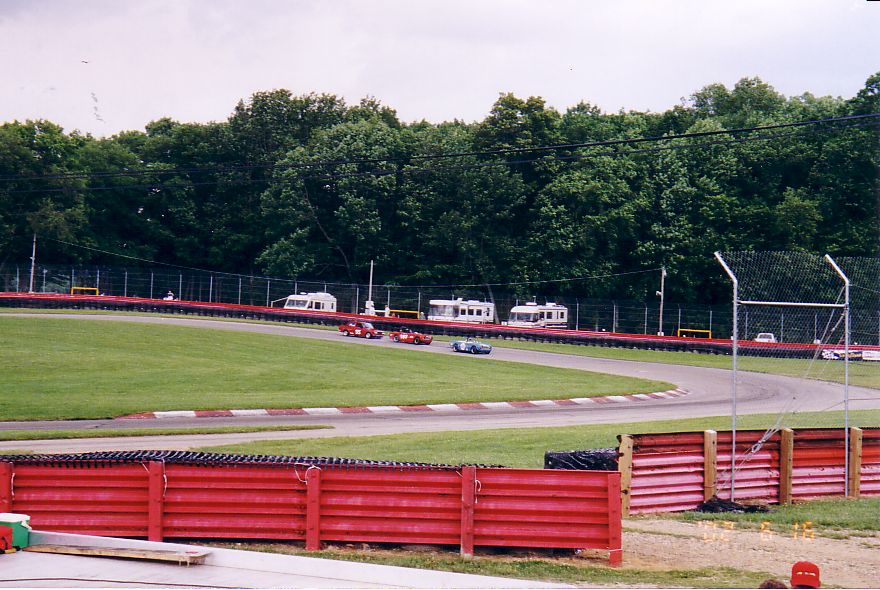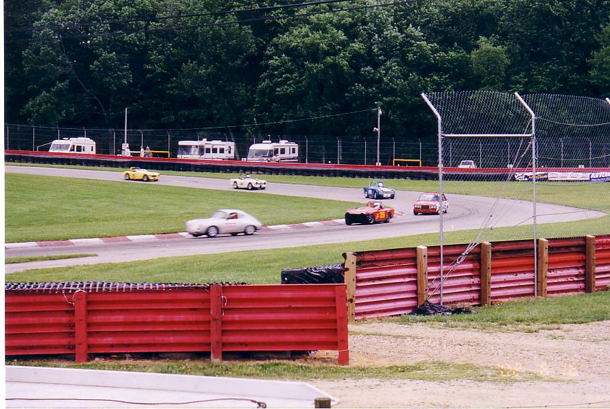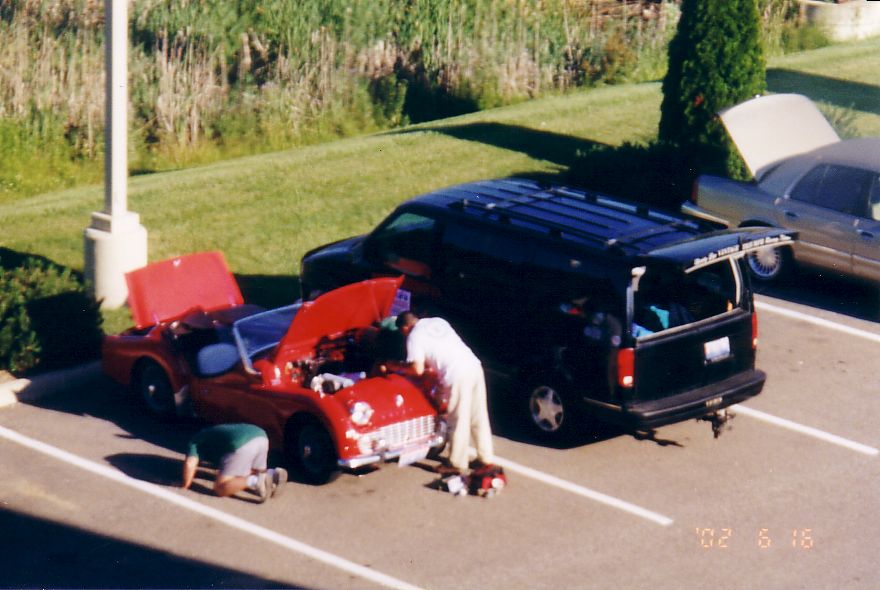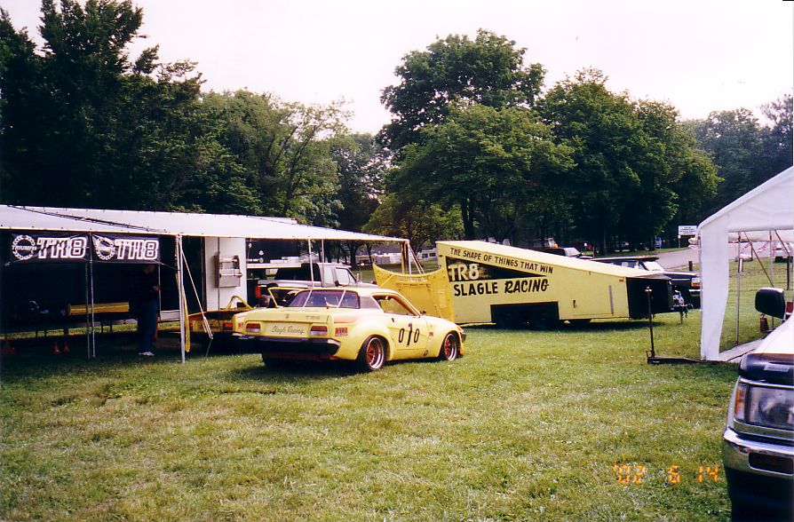 The TR-5 from England lost its front end to the concrete wall. They found a frame shop that would allow them to work on the car at night and stayed up all night fixing the machine. They got the front of a TR-250 from the Nuclear Junkyard (nuclear waste and Triumphs!), and got it back together, a can of Rustoleum Regal Red finished the job. They WON the All-Triumph race when the leading TR-7 V8 lost some of its gears. Last picture is courtesy of Scott Tilton.