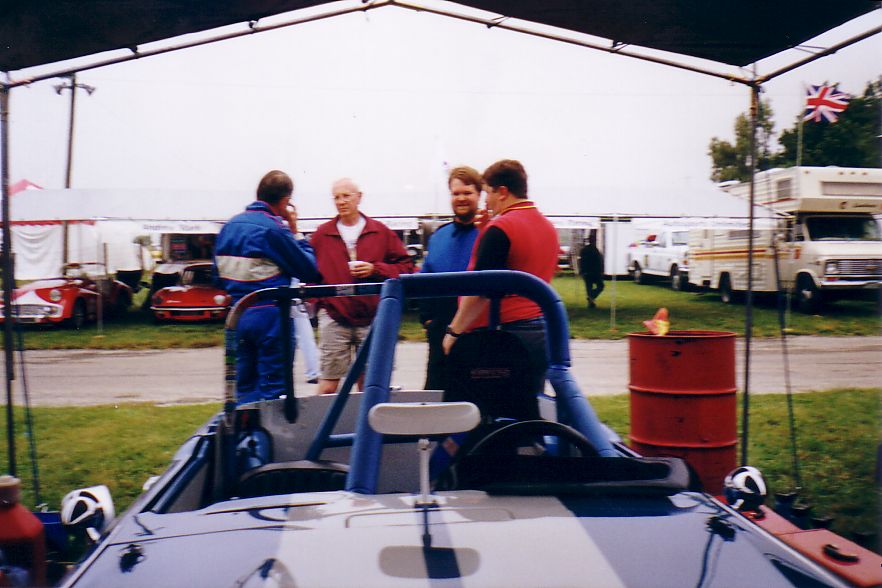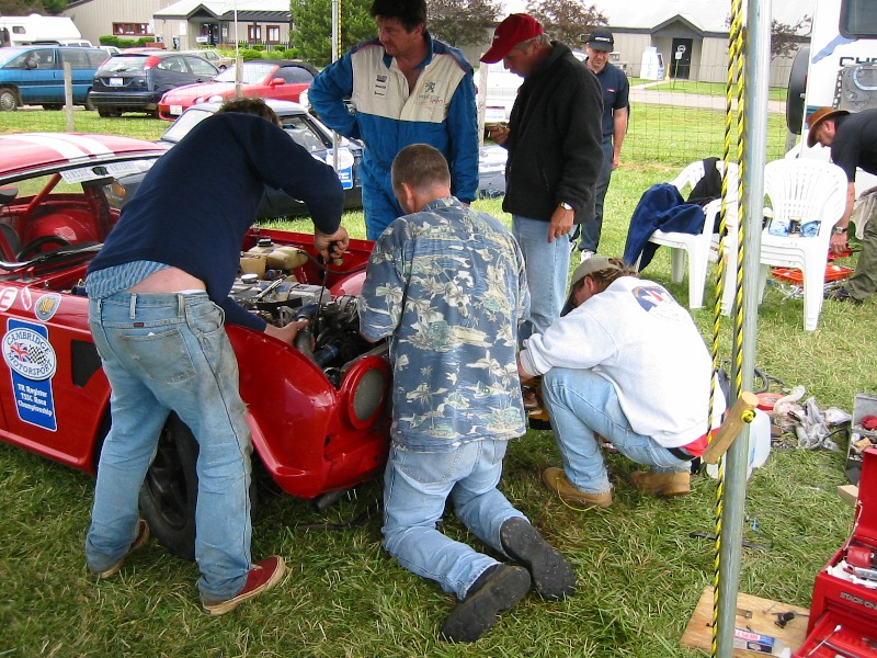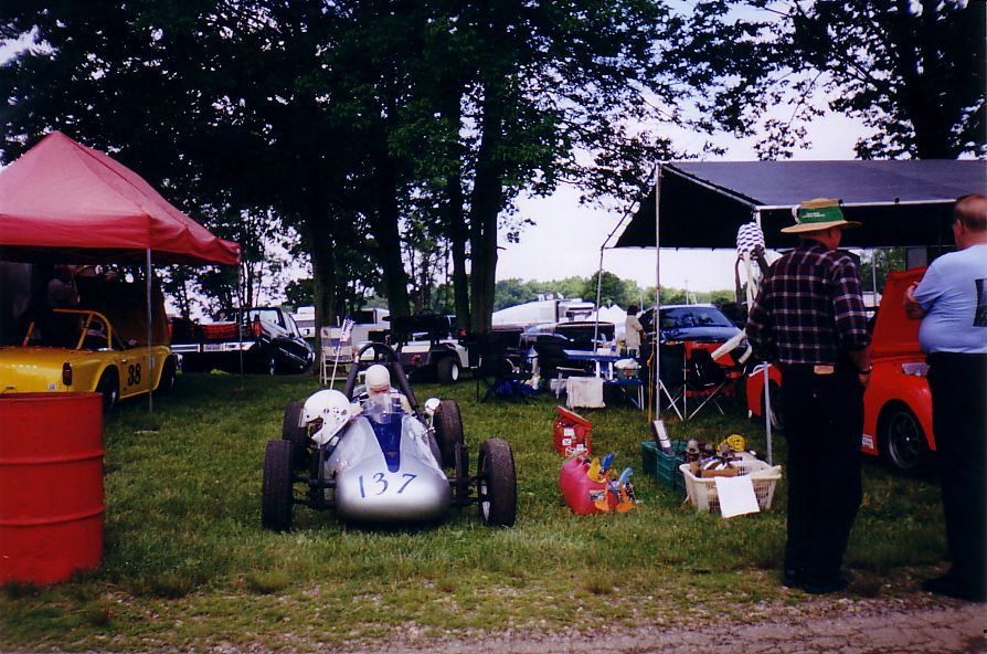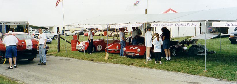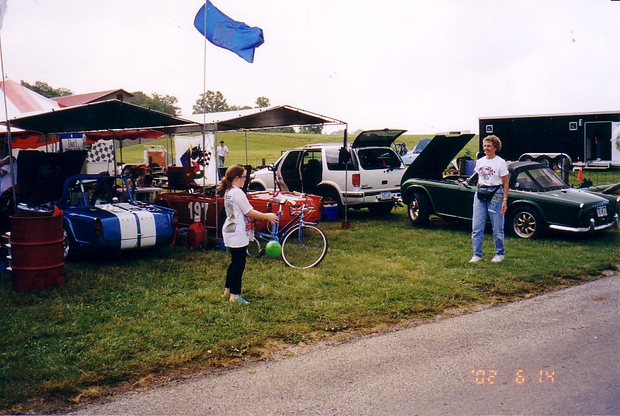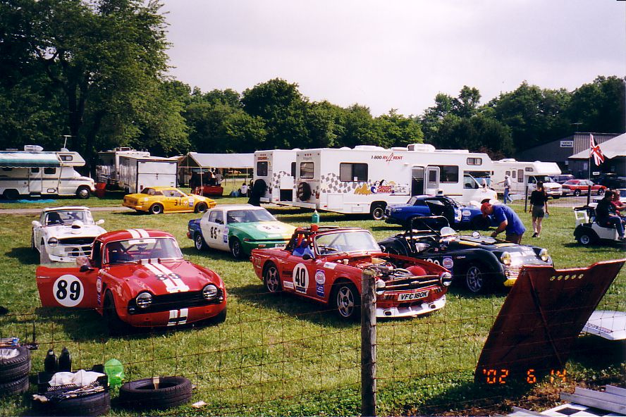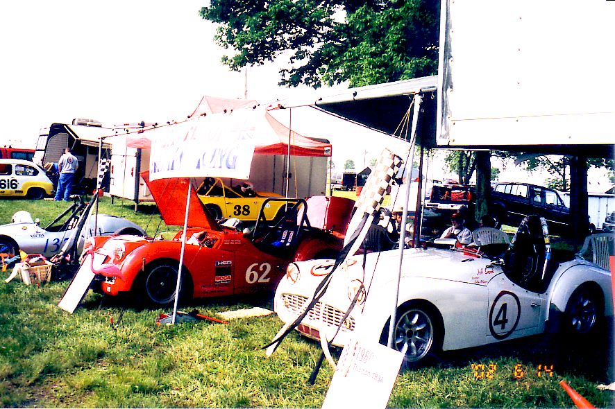 Various Paddock shots. First shot is British iron, note TR-5 before incident above. Then Harkness in his Vee (he's gone to the dark side), Henry Frye in what seems to be his natural position (it'll stop soon, Henry), the Brain Trust discussing something, the Slagle TR-8's, the Snook / Jackson tent (before Jackson hit the skunk), the tent across the road with Susan / Brad, Rosebud, etc. and the uncle jack homefront.