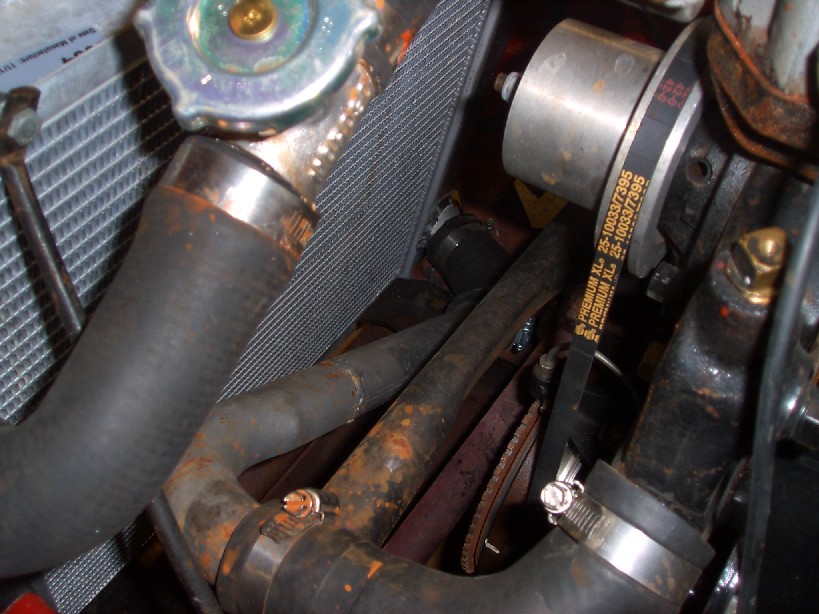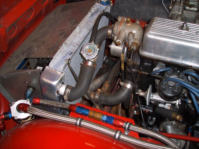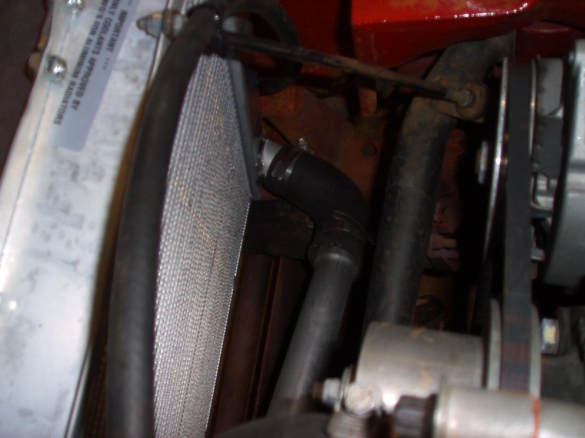 After the install, the radiator cap is usually lower than it was with the stock radiator. There are a couple of approaches to filling the system. Uncle jack had an additional radiator neck welded to the top of the thermostat housing. This makes it very easy to fill the system completely. Be sure to plug the overflow in that housing if you do this mod. Otherwise, all of the water will come out of the overflow due to the pressure of the block side of the cooling being higher than the pressure of the radiator side of the cooling system.