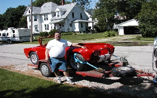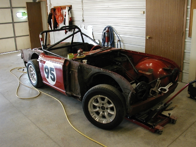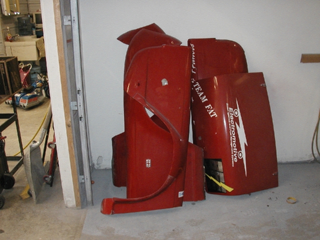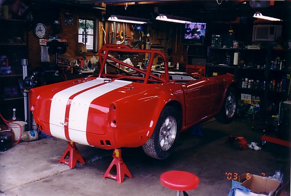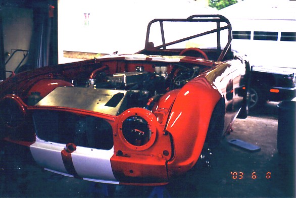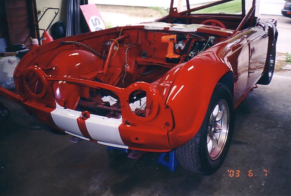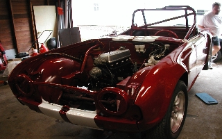 I met a body guy in early 2003 who promised high quality body work and a top notch paint job for $3000 to $3500. I stripped the car, and picked out paint. Meanwhile, the body guy kept delaying my entry into his garage. At the end of May, he told me that he wouldn't be able to paint my car and get it ready in time for the 2003 season. What a blow! He referred me to a body guy in Geneseo who did a decent job on the body work and got shiny paint on the car. It cost considerably more than I originally expected, but the results are quite good. Here's some shots of the bodywork and reassembly.