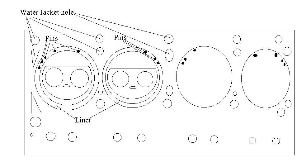 Here's the same drawing, but showing the pins present in the head I got from Jack Wheeler. You'll notice that there are fewer pins - the inner cylinders don't have the pins opposite the intake valves, and there are 2 pins by all of the water jacket holes except for the front one where there are the three that Solow mentions.