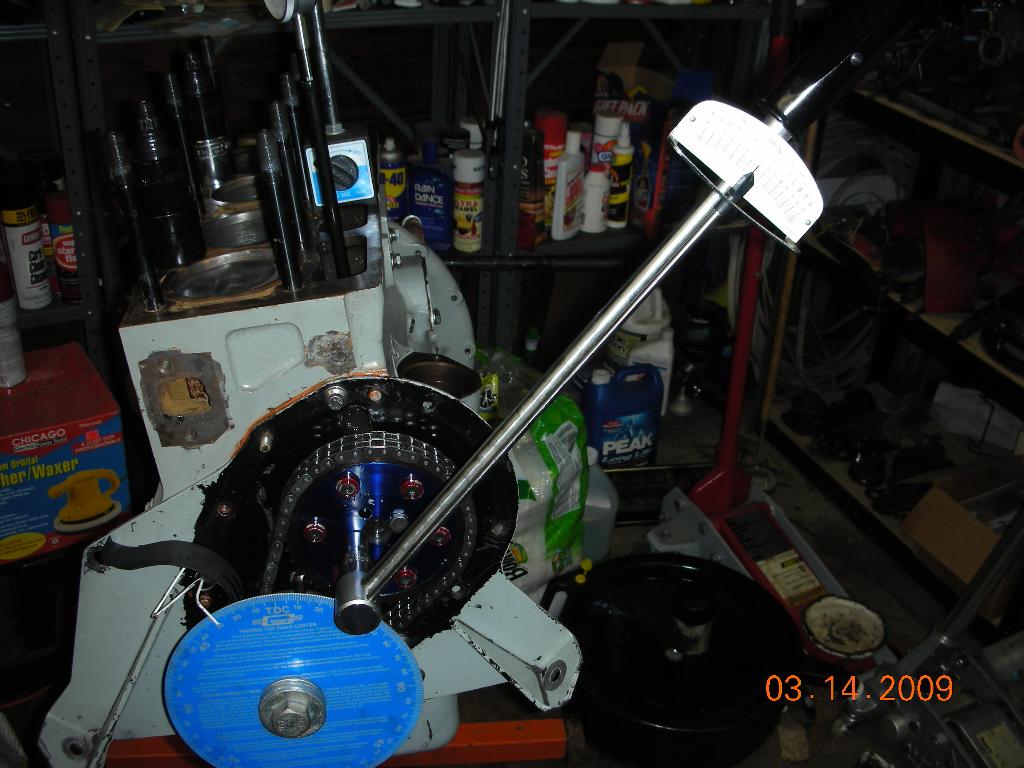 Now we come to "degreeing the cam". I put a degree wheel on the front of the crank, and use a dial indicator to set the top dead center (TDC) mark accurately.