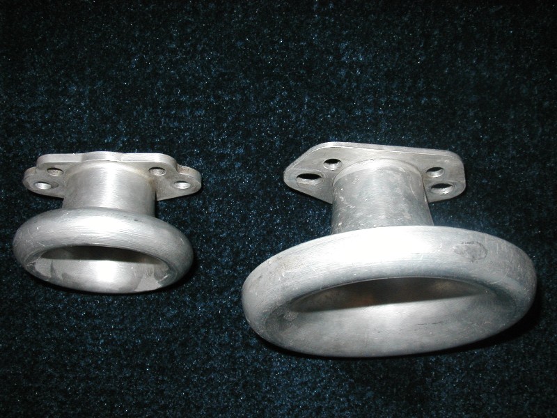 Velocity stacks for TR4. Parabolic horn, 3" long and 5" diameter, 3/16" mounting plate. Duplicates of horns available about ten years ago. As run by George Wright and Chip Bond. Designed by an aerospace engineer in cooperation with Kas Kastner. Originally manufactured by Moon. Pictured with the most popular currently available stack (smaller of the two). Users reported measurable performance increase. Price is $140 / pair including shipping.